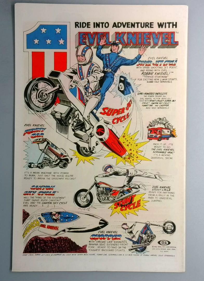 A vintage Bronze Age collectible that brings the cinematic vision of 2001 to comic book readers, featuring the classic 30-cent cover price and period Marvel house ads including promotions for Evel Knievel action figures and vehicles, reflecting the toy tie-in culture of the 1970s.
