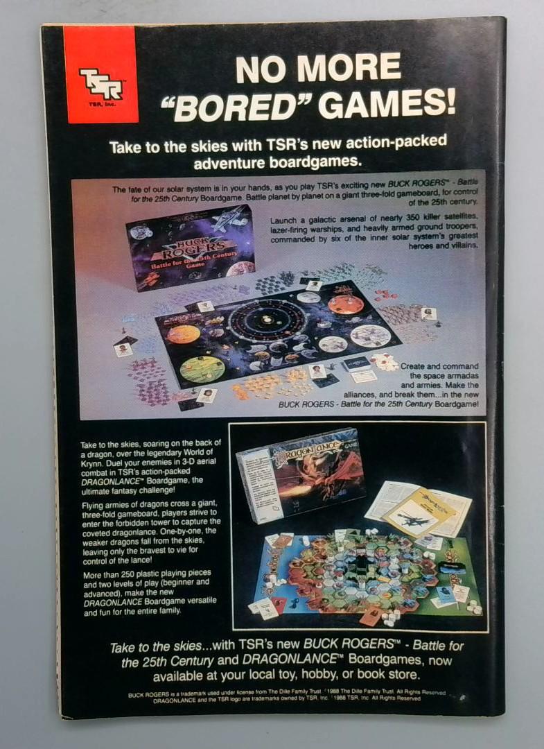 A vintage advertisement on the back cover promotes TSR's action-packed adventure boardgames, including Buck Rogers: Battle for the 25th Century and Dragonlance, offering a snapshot of 1980s gaming culture alongside the comic content.