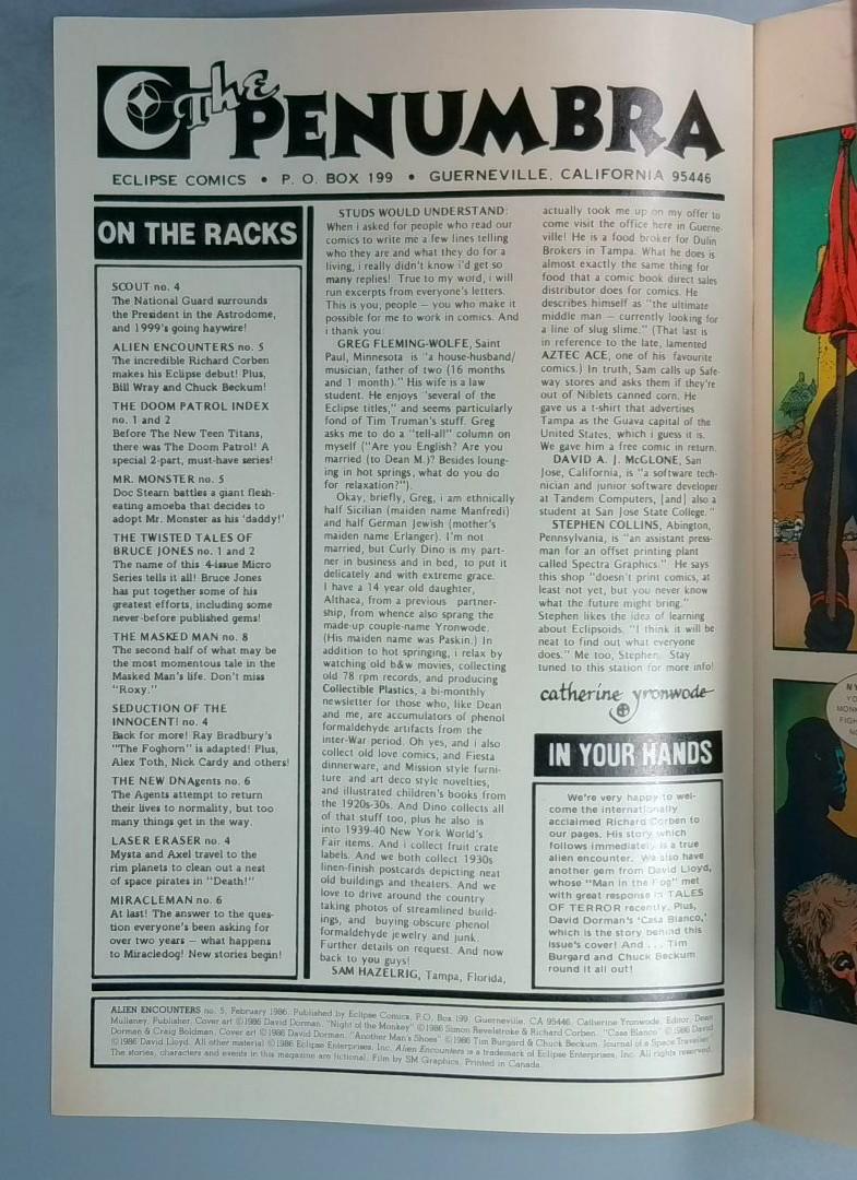 Keywords: Alien Encounters Eclipse Comics 1985 science fiction independent comics Night of the Monkey comic book vintage comics character design readers letters