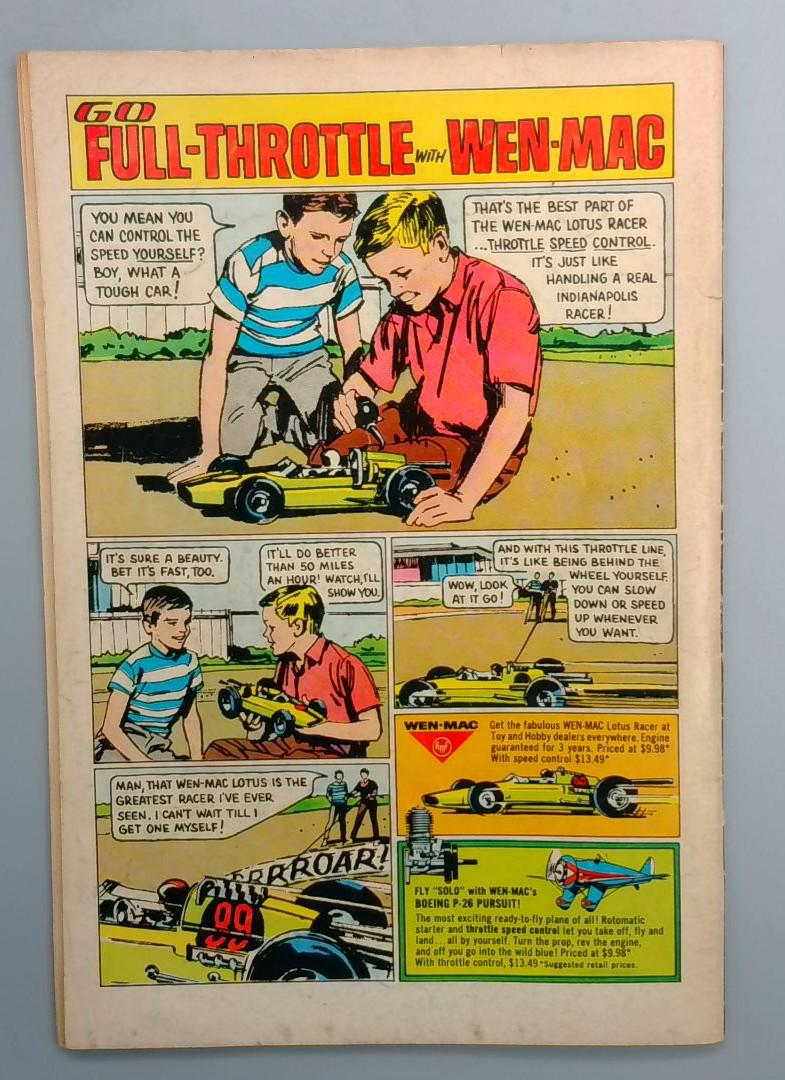 The interior includes the story "Go Full-Throttle with Wen-Mac," a promotional adventure highlighting the Wen-Mac Lotus Racer toy with speed control features. This cross-media tie-in was typical of DC's youth-oriented war comics of the era, blending action storytelling with toy advertising.