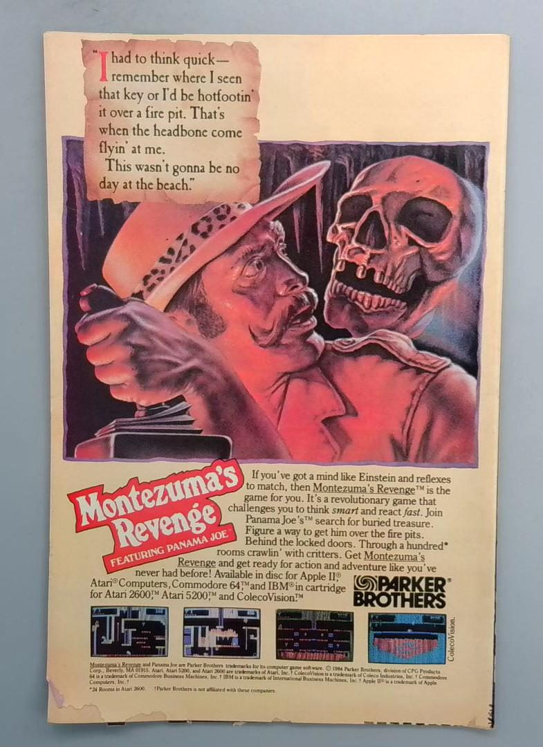 The back cover features an advertisement for Montezuma's Revenge, a Parker Brothers computer game featuring Panama Joe, offering a glimpse into the entertainment landscape of the 1980s alongside classic Marvel storytelling.