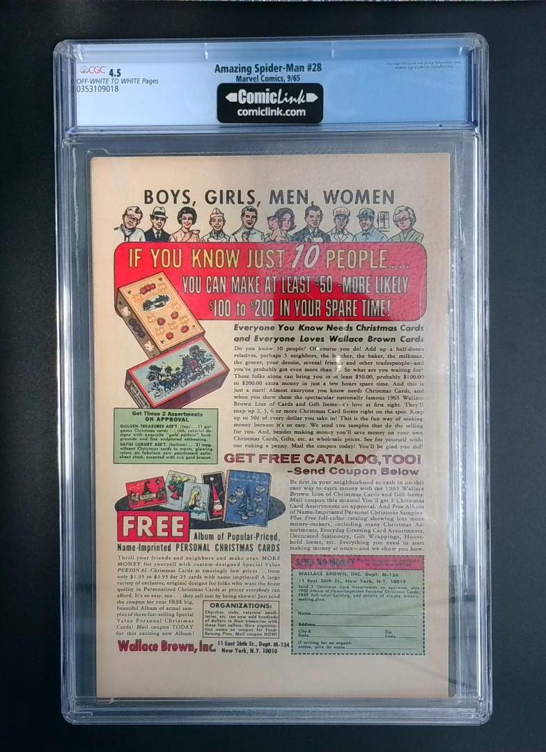 Amazing Spider-Man #28 features the first appearance of the Molten Man, a distinctive villain with a golden metallic appearance. This landmark issue also highlights a significant moment in Peter Parker's personal life with his graduation. The cover dramatically depicts Spider-Man confronting the Molten Man in a shadowy, dynamic composition that captures the intense conflict between the hero and this new antagonist. CGC Universal Grade 4.5 comic, graded with off-white to white pages.