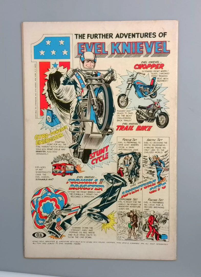 Astonishing Tales #33 features the character Deathlok, a cybernetic warrior known as "The Demolisher". This issue explores the concept of "The God Machine", showcasing Deathlok in a gritty sci-fi narrative that blends mechanical augmentation with human struggle. The comic presents a dystopian storyline with dynamic artwork typical of 1970s Marvel comics, highlighting Deathlok's unique design and existential challenges as a part-human, part-machine protagonist. The second image appears to be an advertisement for Evel Knievel merchandise and toy sets, which is not part of the comic book listing description.