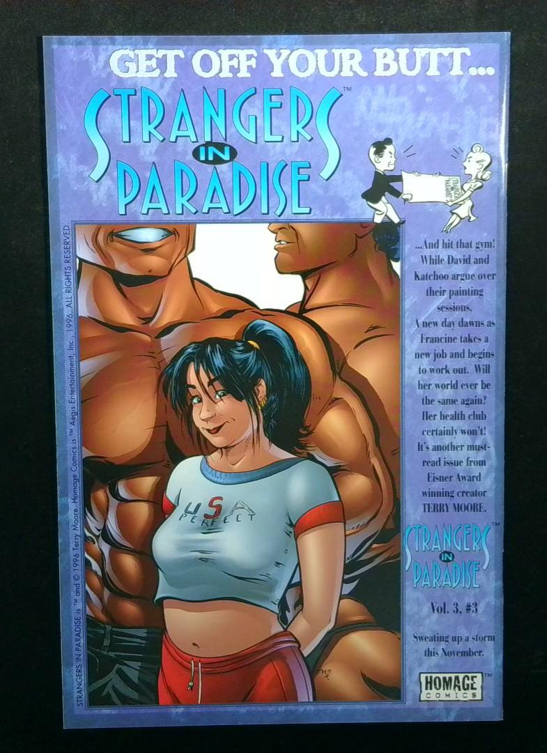 Kurt Busiek’s Astro City #3 — A character-driven installment of Busiek’s acclaimed superhero anthology that mixes everyday human drama with superheroic mystery; the striking milk-carton “Have You Seen Me?” cover underscores the issue’s focus on missing-people and small-town impact. Published under the Homage imprint. Strangers in Paradise Vol. 3 #3 — Terry Moore’s Eisner-recognized soap-opera-in-comics continues as Francine takes a new job and begins working out while tensions rise between David and Katchoo over their painting sessions; another intimate, character-focused chapter in the series. Homage Comics.
