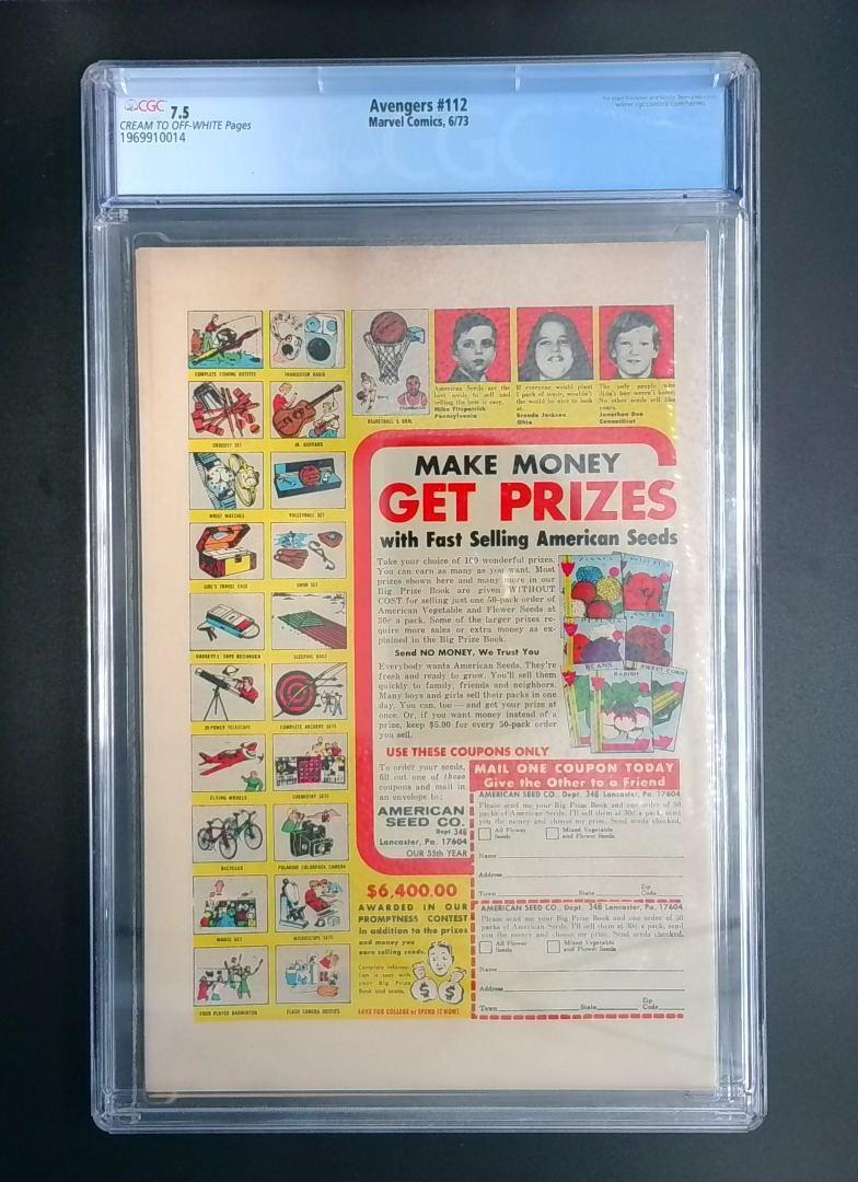 Avengers #112 features Earth's Mightiest Heroes in an epic battle, highlighting the team's dynamic and heroic confrontations. The issue showcases multiple Avengers characters, including a dramatic scene with characters like Iron Man and Thor. The cover teases "The Lion God Awakes!" and promises "The End of an Avenger!" This issue represents a classic Bronze Age Marvel comic with intense action and dramatic storytelling. CGC graded 7.5, encapsulated in a CGC Universal Grade case, indicating a well-preserved comic from this era.
