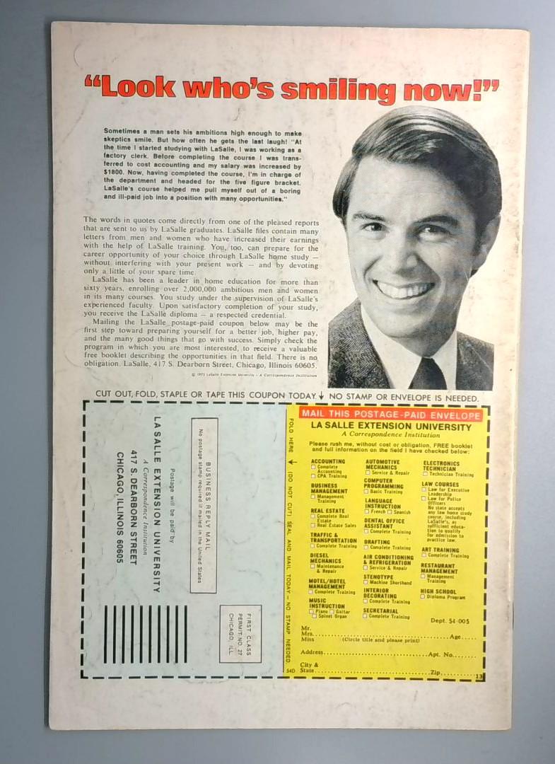 The back cover includes a vintage LaSalle Extension University advertisement with a mail-in coupon, typical of educational promotions found in comics of this era. A great addition to any Avengers collection, particularly for fans interested in the character origins that would eventually lead to major storylines across the Marvel Universe.