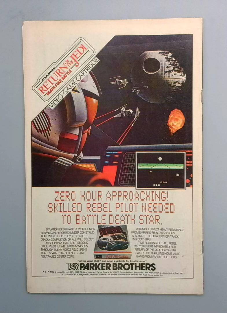 The issue includes an advertisement for the Parker Brothers video game adaptation, showing vintage 1980s gaming imagery and promoting "Return of the Jedi" themed gameplay with the Death Star featured prominently in the advertisement.
