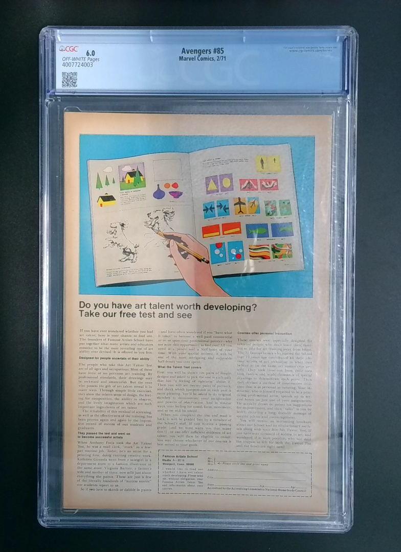 The Avengers #85 features the return of the Squadron Sinister, a villainous team that mirrors the Justice League. The comic explores a dramatic scenario where the Earth appears to be facing total disintegration, with characters expressing despair and helplessness. The cover dramatically depicts ghostly figures against a fiery red background, highlighting the high-stakes narrative. This issue is part of a significant storyline involving alternate realities and superhero confrontations. CGC Universal Grade 6.0, with the grading label indicating the first appearance of the Squadron Supreme.