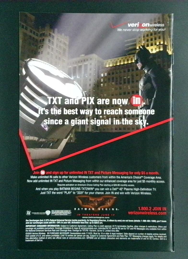 This copy includes a Verizon Wireless advertisement on the back cover promoting their IN service and a Batman Begins movie tie-in promotion, dating this issue to the mid-2000s era of Batman comics.