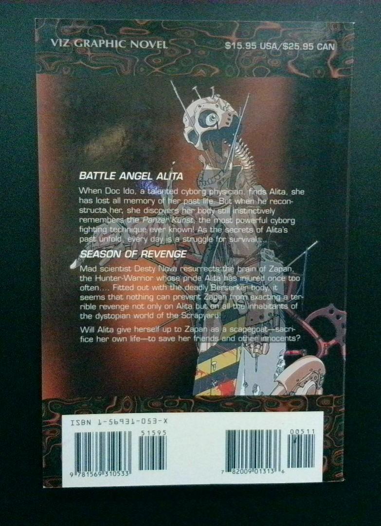 This volume collects two major story arcs from the Battle Angel Alita saga. In "Battle Angel Alita," the talented cyborg physician Doc Ido discovers Alita, a cyborg with no memory of her past life. When Ido reconstructs her body, Alita's instincts remember the Panzer Kunst, the most powerful cyborg fighting technique ever known—setting the stage for her best untold survival struggles. In "Season of Revenge," mad scientist Desty Nova resurrects the brain of Zappa, the Hunter-Warrior whose pride Alita has injured, and fits him with the deadly Berserker body. As Zappa prepares his terrible revenge on Alita and the inhabitants of the Scrapyard, Alita must decide whether to sacrifice herself to save her friends and others.