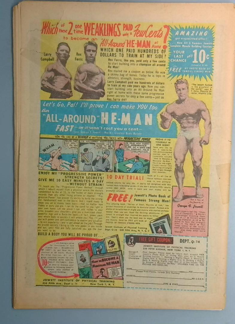 This issue also contains period advertisements, including a notable "All-Around He-Man" bodybuilding course advertisement typical of Golden Age comics, offering progressive physical training methods and various promotional tie-ins for readers interested in strength building.