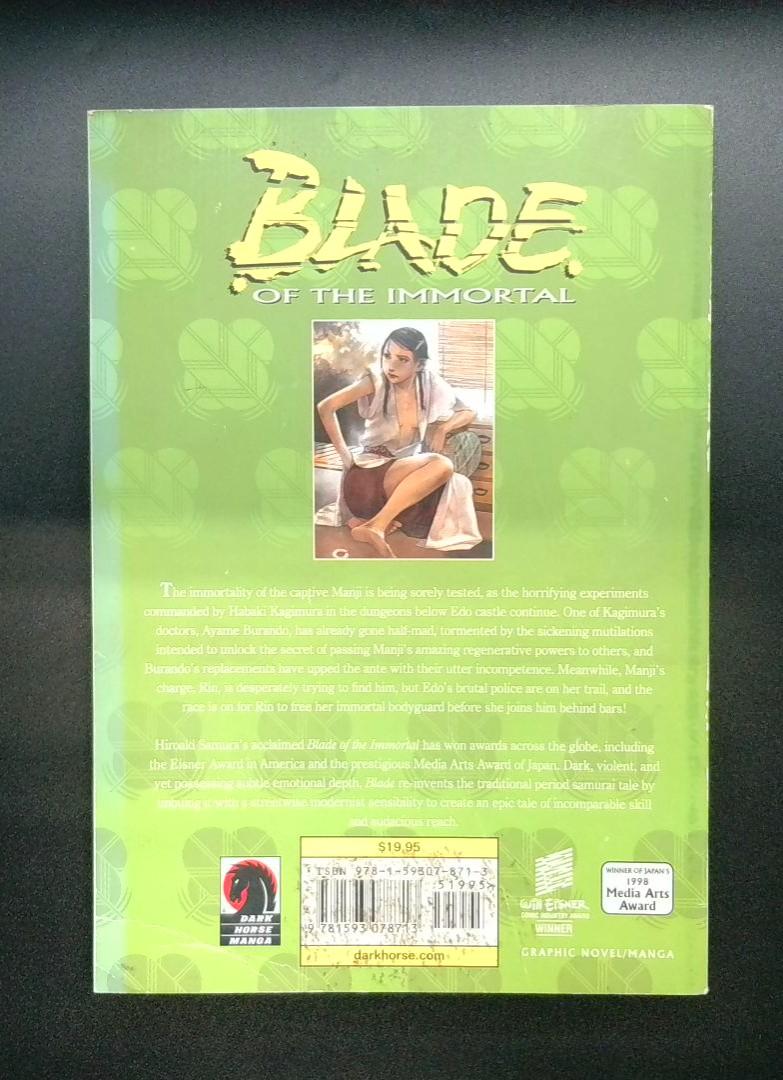 This volume continues the dark samurai saga of Manji, an immortal swordsman bound by a cursed parasitic force. The story follows Manji as he faces new challenges to his immortality while navigating dangerous adversaries and uncovering secrets tied to his regenerative powers. The narrative blends traditional samurai storytelling with visceral action and complex character development.