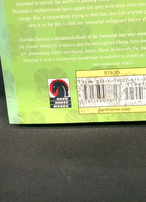 Blade of the Immortal has earned international recognition, including the Eisner Award in America and the prestigious Media Arts Award from Japan. Known for its dark, violent content and emotional depth, this acclaimed series reinvents the samurai tale with incomparable skill and artistic mastery. This book collects issues one hundred eighteen through one hundred twenty-six of the comic-book series Blade of the Immortal. Black residue on barcode and some folding of the back cover (see picture).