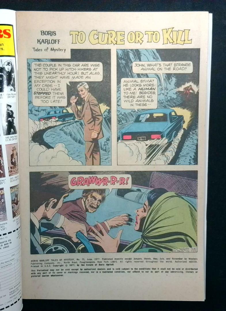 Gold Key's Boris Karloff Tales of Mystery #75 (June 1977) features the host-driven anthology format and a pulpy lead story where two modern-day thieves stumble into an ancient, treasure-filled world and face monstrous guardians. The main tale, titled "To Cure or To Kill," blends gothic horror, adventure and suspense in classic 1970s painted-art style. Painted cover art and Karloff hosting give this issue a vintage horror-movie tie-in appeal.