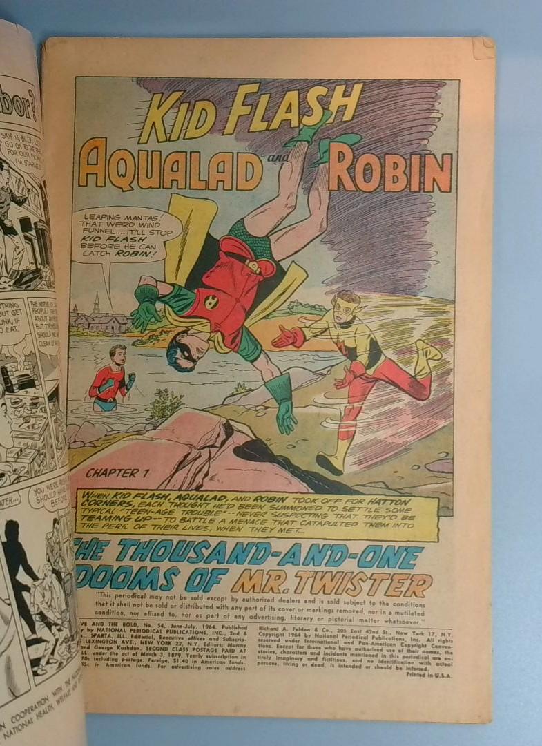 Keywords: Brave and the Bold DC Comics Kid Flash Aqualad Robin vintage comic 1964 comic superhero team-up Mr. Twister Teen Titans