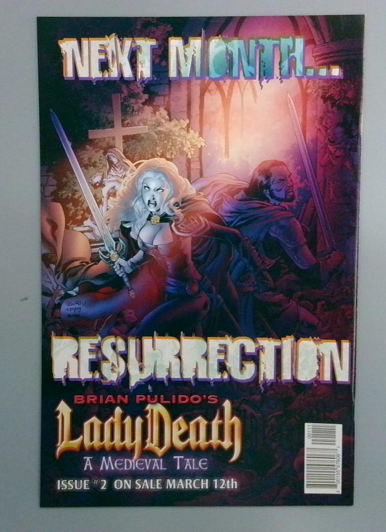 Next Month Promotion: The back cover advertises the upcoming Lady Death: A Medieval Tale #2 - Resurrection, set to release on March 12th, continuing the story with new artwork showcasing the character's dramatic evolution.