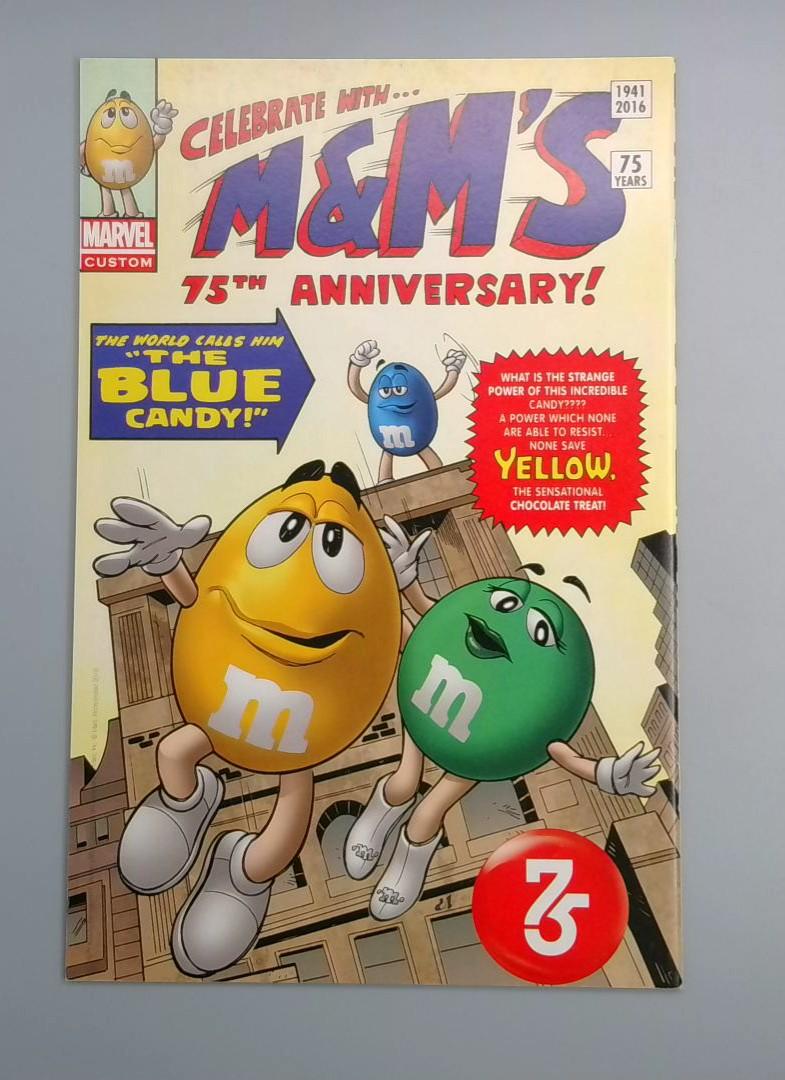 Bullseye #1 "Running with the Devil" - A Marvel comic featuring the debut of a new series focusing on the notorious Marvel villain Bullseye. The issue promises intense action and a dark narrative, with the character prominently displayed against a striking red and black graphic background. The cover indicates mature content with a parental advisory label, suggesting a gritty and potentially violent storyline. M&M's 75th Anniversary Special Edition - A commemorative comic-style magazine celebrating 75 years of the M&M's brand, featuring the iconic candy characters in a vintage comic book design. The issue highlights the Yellow and Blue M&M's with playful marketing language and a nostalgic aesthetic that references the brand's long history from 1941 to 2016.