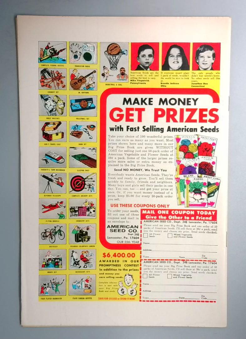 This issue also includes vintage advertising and promotional content typical of the era, including a seed company mail-in offer on the back cover pages, reflecting the merchandising landscape of 1970s comic books.