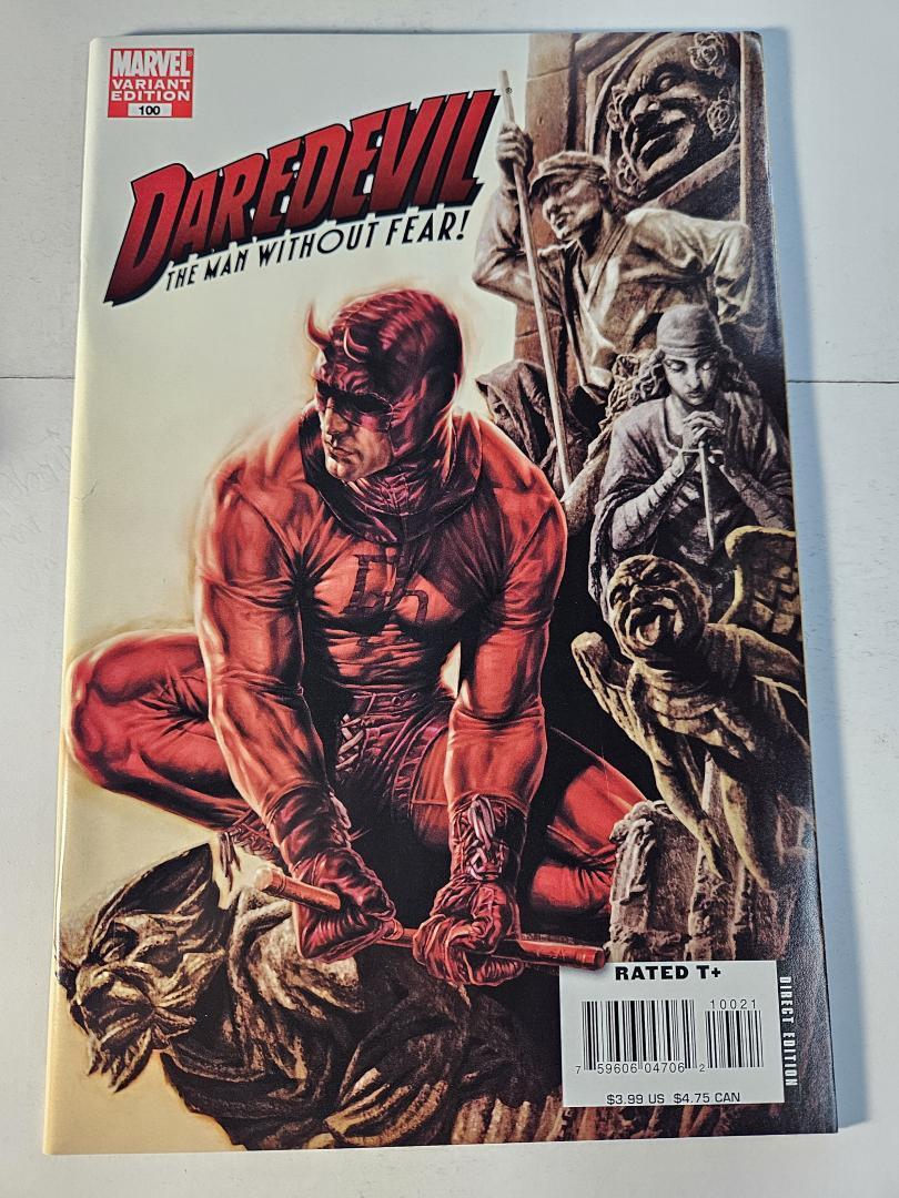 Daredevil: The Man Without Fear! #100 features a variant edition cover showcasing Daredevil in a dynamic pose, surrounded by haunting statues. This issue celebrates a milestone with a thrilling storyline, where Daredevil faces off against his arch-enemies in a gripping confrontation. Known for its intense action and rich character development, this edition captures the essence of Daredevil’s fearless persona. The cover art is detailed and striking, adding to the comic's collectible appeal.