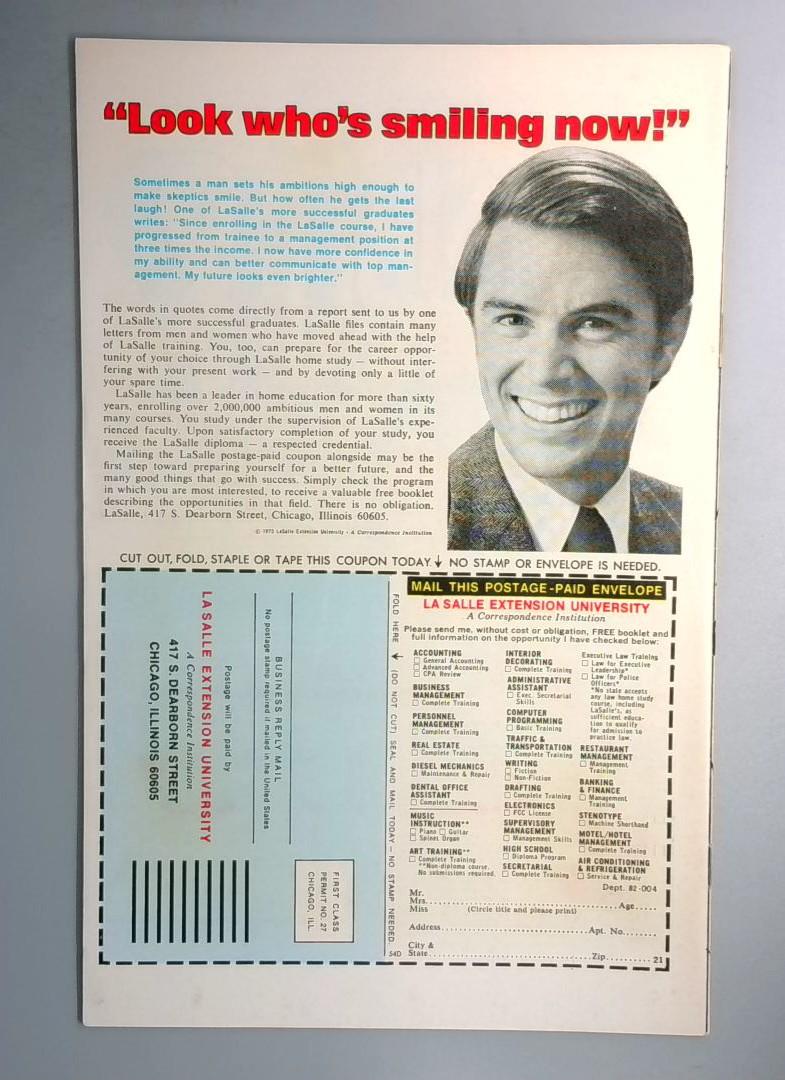 The back cover features a LaSalle Extension University advertisement, a common sight in Marvel comics of this era, offering correspondence courses in various career fields.