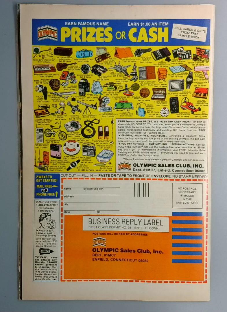 This issue also includes a classic Olympic Sales Club promotional insert on the back cover, featuring an array of vintage prizes and merchandise offers typical of Marvel Comics from this era.