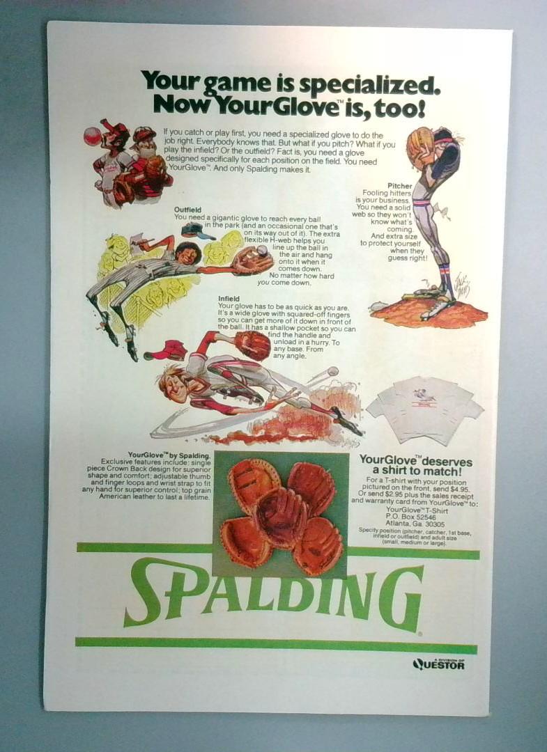 The issue also includes a Spalding sports equipment advertisement promoting specialized baseball gloves for different positions, a charming artifact of vintage comic book marketing from this era.