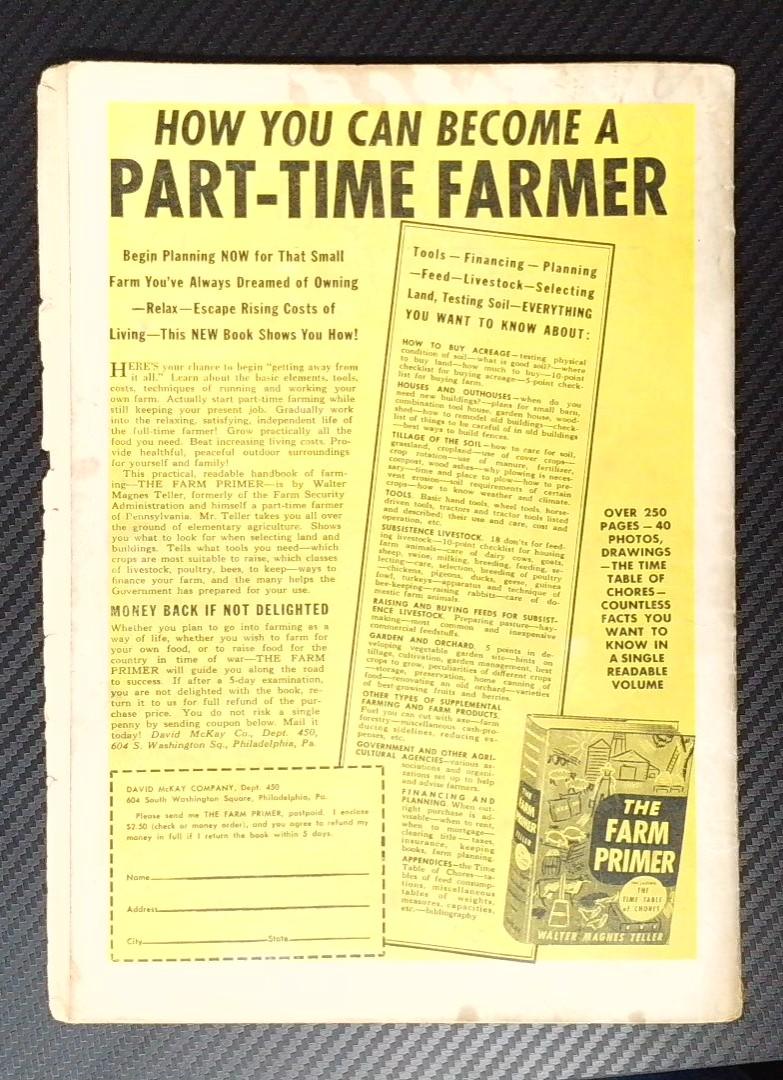 The book also includes period advertising, notably a full-page advertisement for "The Farm Primer" by Walter Magnus Teller, reflecting the educational and practical literature promoted during the 1940s era. A fun, historically significant piece of Golden Age comics entertainment.