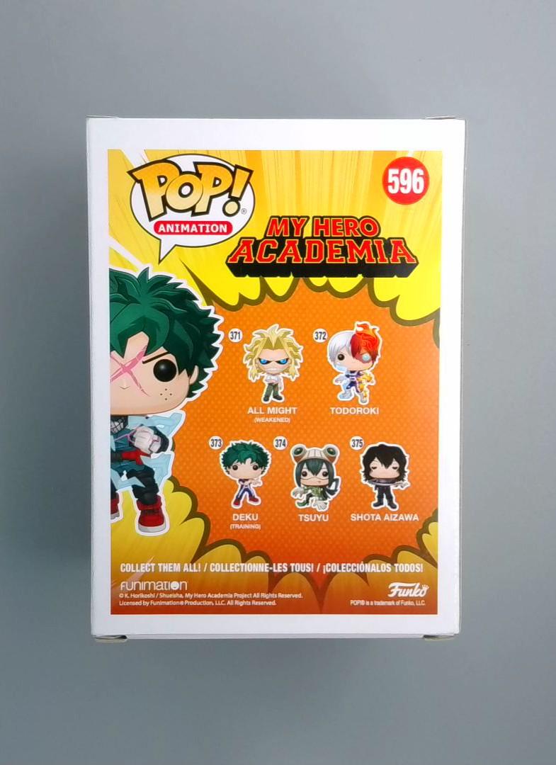 Funko Pop! of Deku from My Hero Academia, number 596, featuring the character in his iconic green hero costume with a dynamic pose. This Entertainment Earth exclusive variant glows in the dark and includes a pink X scar detail. The vinyl figure comes in a near-mint condition box with minimal shelf wear, and displays the character's distinctive spiky green hair and heroic stance. The packaging is clear and intact, with all original labels and stickers present.