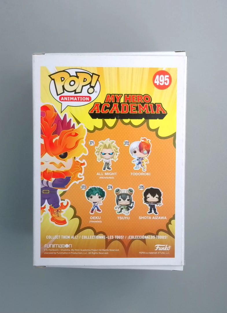 Funko Pop figure of Endeavor from My Hero Academia, number 495 in the Animation series. The figure captures the flame hero in a dynamic pose, with vibrant red and orange flames emanating from his body, highlighting his fiery quirk. Exclusive to GameStop, the vinyl figure features Endeavor in a blue costume with a fierce, determined expression. The box appears to be in excellent condition with no visible damage, and the packaging is clean and intact.