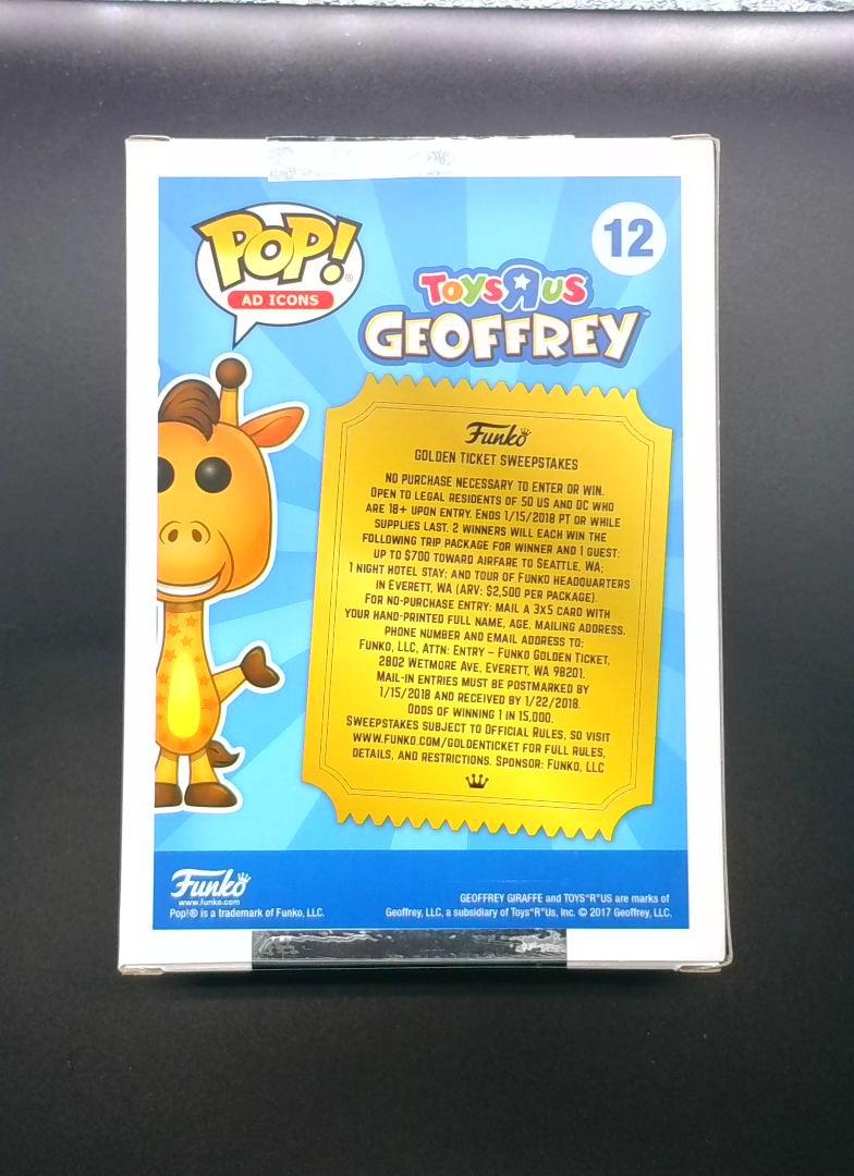 Toys R Us exclusive Funko Pop Ad Icons #12 featuring Geoffrey the Giraffe in a stylized vinyl figure form. The figure is predominantly orange with a bright, cartoonish design, showcasing Geoffrey with a wide grin and large eyes. The box is in great condition with a Toys R Us exclusive sticker but a broken seal for the Golden Ticket Sweepstakes. This collectible is a must-have for fans of the Toys R Us mascot and Funko Pop collectors.