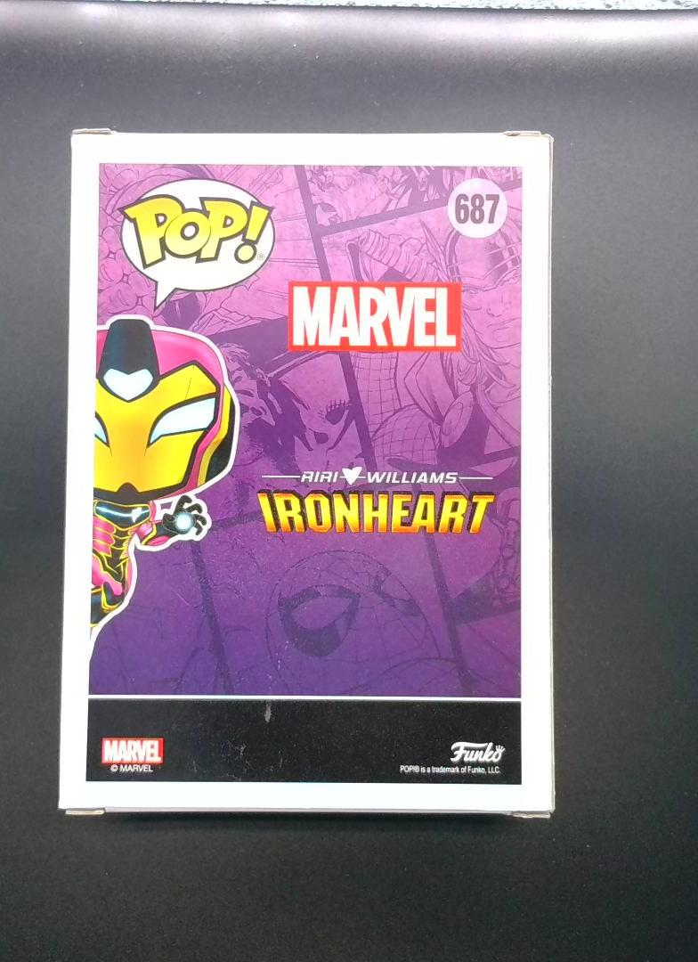 Marvel Funko Pop #687 featuring Ironheart in a dynamic pose with a pink and yellow color scheme. This is a limited edition Glow Chase variant with a special Pop In A Box exclusive sticker. The figure has a sleek, stylized design capturing the character's high-tech armored look, with white eye details and metallic accents. The box appears to be in excellent condition with no visible damage, making it a pristine collectible for Marvel and Funko Pop enthusiasts.