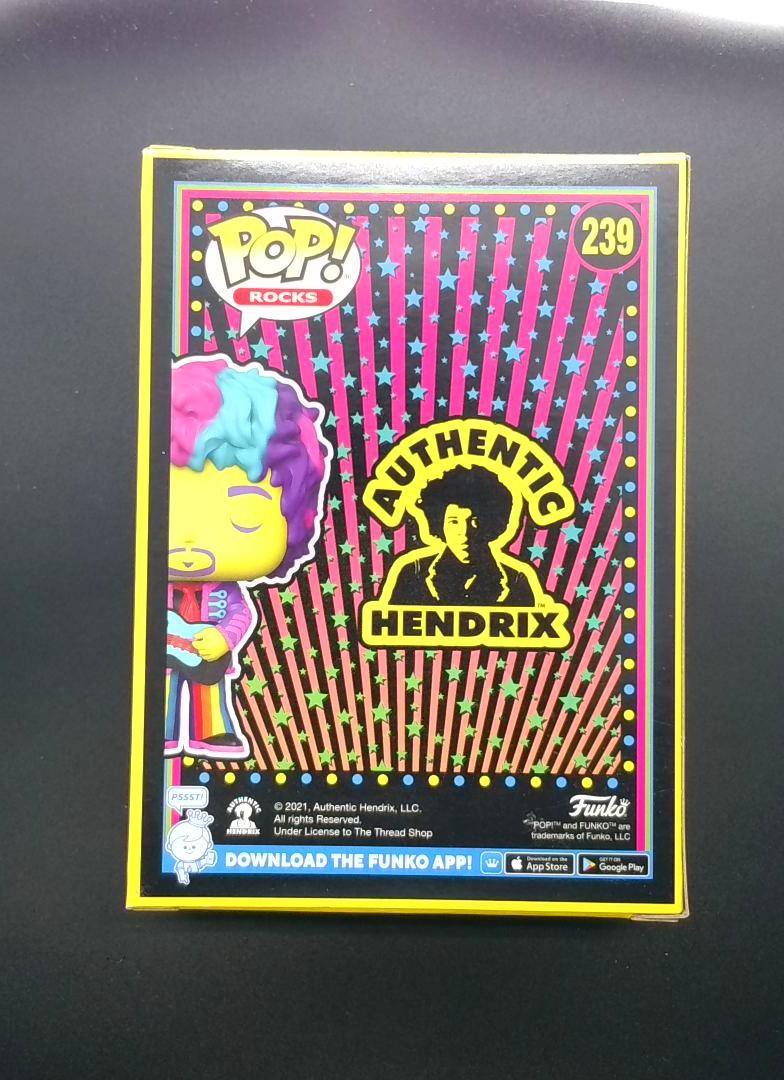 Funko Pop! Jimi Hendrix vinyl figure #239 in vibrant neon colors, featuring the legendary musician with closed eyes and holding a guitar. This is a 2021 Fall Convention Limited Edition exclusive, with a colorful psychedelic design showcasing Hendrix in a stylized, cartoonish form. The figure comes in a well-preserved box with minimal wear, highlighting the bright yellow, pink, and blue color scheme. The packaging includes the Funko Pop! Rocks branding and an "Authentic Hendrix" seal, making it a collectible piece for music and Pop! figure enthusiasts.