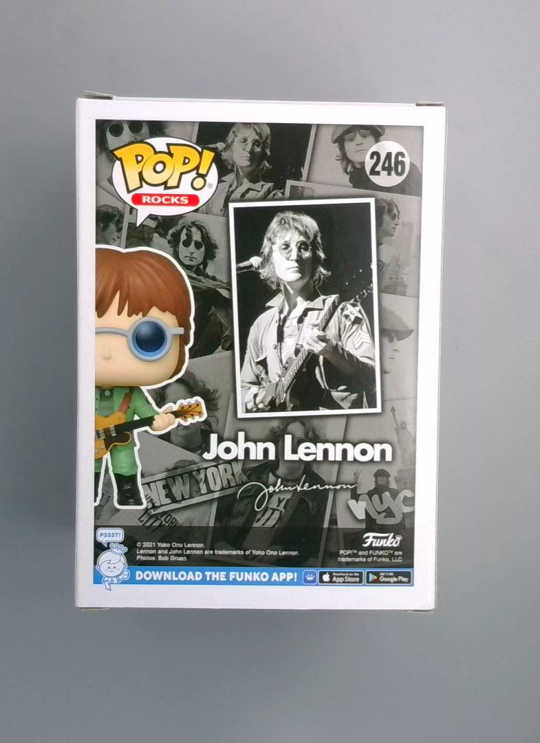 Funko Pop! Rocks vinyl figure of John Lennon, number 246 in the series. Features the musician in a green outfit, wearing his iconic round blue-tinted glasses, holding an acoustic guitar. The figure captures Lennon's distinctive 1960s look with a classic pose. Box appears to be in excellent condition with clear, vibrant packaging and no visible damage.