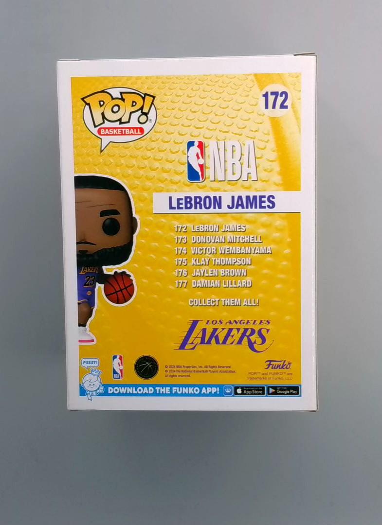 Funko Pop vinyl figure of a basketball player in Los Angeles Lakers purple and gold jersey, numbered 172 in the series. The figure depicts the player with a beard, holding a basketball, wearing jersey number 23. The packaging appears to be in excellent, mint condition with no visible damage or wear. This is a collectible item from the Funko Pop Basketball line, featuring a stylized representation of a well-known NBA player.