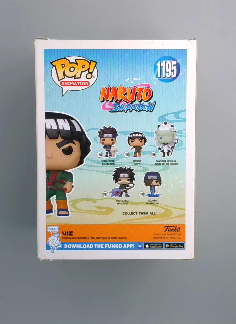 Naruto Shippuden Might Guy Funko Pop vinyl figure #1195, featuring the character in his signature green outfit and black bowl-cut hairstyle. The figure is posed in a dynamic stance, capturing Might Guy's energetic personality. The packaging appears to be in great condition with minimal damage, and the box includes the standard Funko Pop branding and character information. A must-have collectible for Naruto fans and Funko Pop enthusiasts.