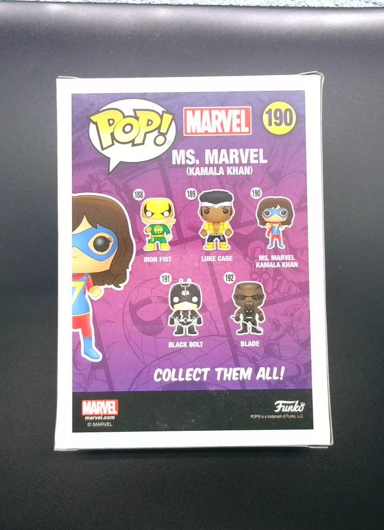 Funko Pop Marvel figure #190 featuring Ms. Marvel (Kamala Khan) in her iconic blue mask and red/blue costume. The bobblehead-style vinyl figure is posed in a dynamic stance with clenched fists. This is a Walgreens exclusive release, as indicated by the store logo on the box. The box appears to be in good condition with a small cut on top of the box.