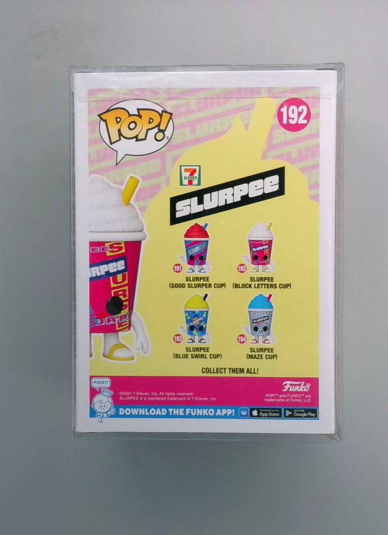 Funko Pop! #192 Slurpee (Block Letters Cup) is a 7-Eleven exclusive vinyl figure featuring the iconic pink and red Slurpee cup design with classic block lettering and the 7-Eleven logo. The figure has a white lid/straw detail and black circular design elements on the cup. This collectible is in excellent condition with a clean, undamaged box showing no significant wear. The packaging clearly displays the exclusive 7-Eleven badge and product details.