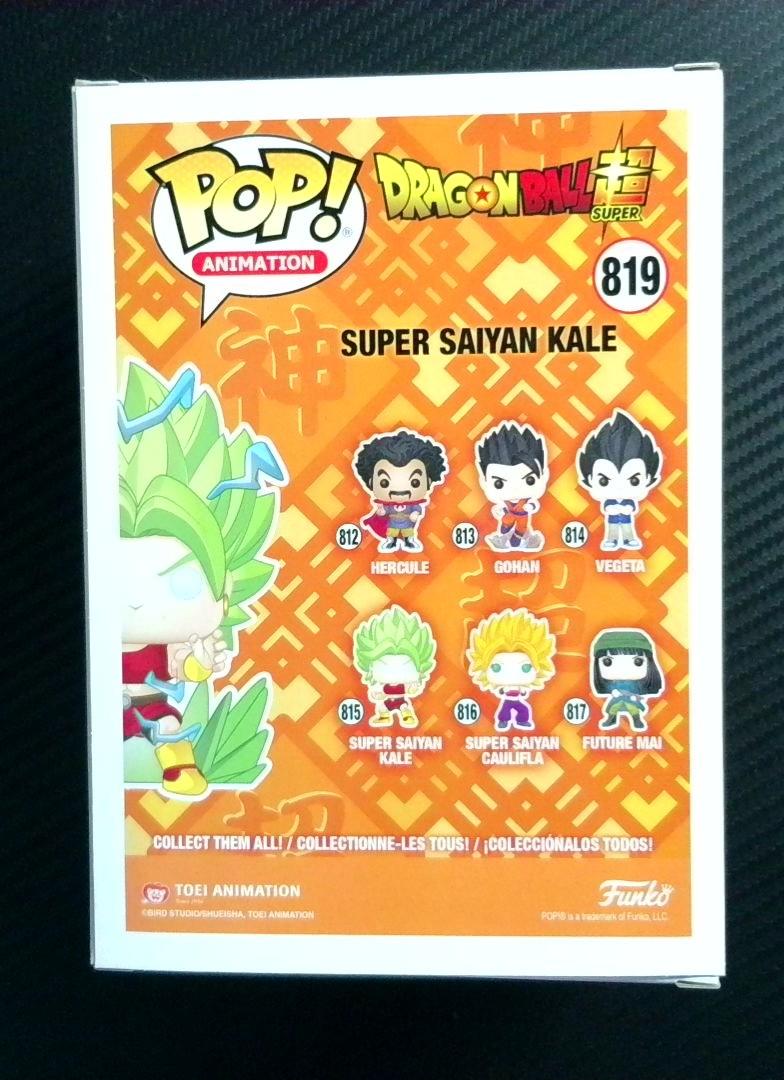 Funko Pop Dragon Ball Super #819 featuring Super Saiyan Kale in her signature green-haired transformation pose with energy aura effect. The figure captures the character's intense expression and powerful stance. Box is in excellent condition with vibrant orange and yellow Dragon Ball Super branding and artwork. Chase Collectibles exclusive variant with minimal wear to packaging.