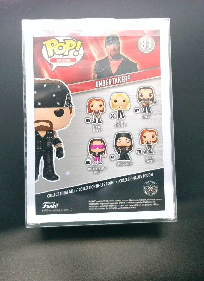 Funko Pop WWE Undertaker #81 Amazon Exclusive vinyl figure featuring the legendary wrestler in his iconic biker attire with studded vest, bandana, and goatee. The figure captures Undertaker's intimidating presence with detailed sculpting of his signature look. Box is in good condition with clear packaging and Amazon Exclusive branding visible. No significant damage noted to figure or packaging.