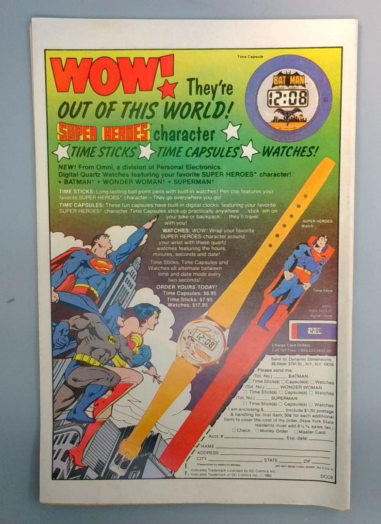 The back cover includes a vintage advertisement for Super Heroes character time sticks, time capsules, and digital watches from Omni/Personal Electronics, showcasing the merchandising tie-ins popular during the early 1980s.