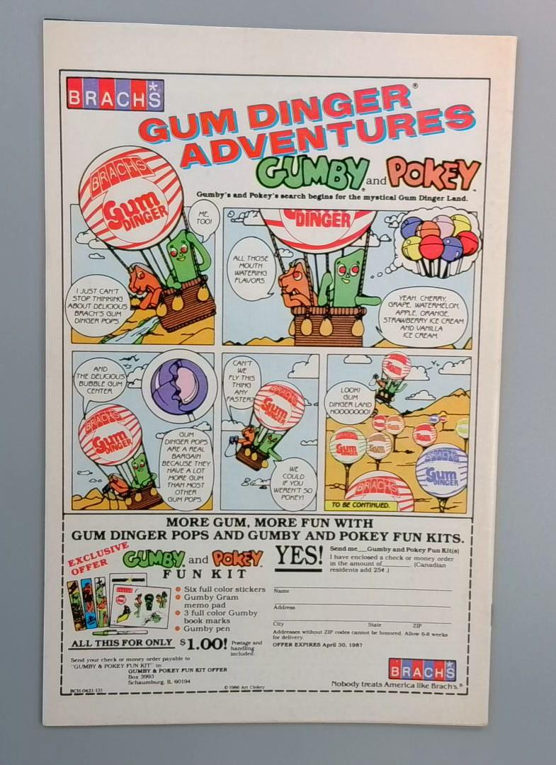 G.I. Joe: A Real American Hero #54 (Dec) finds the Joes launching a daring parachute assault against a Cobra stronghold as jets, explosions and close-quarters combat erupt in the skies above. Classic late-80s Marvel installment featuring full-team action against Cobra with a bold, dynamic cover. Back cover includes a Gum Dinger/Gumby & Pokey advertising strip.