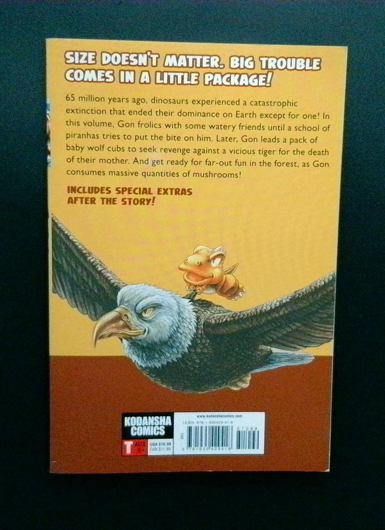 This volume follows the adventures of Gon, a small but fierce dinosaur who survived the extinction event that wiped out his species 65 million years ago. In this installment, Gon frolics with aquatic friends until a school of piranhas threatens his safety. The story escalates as Gon leads a pack of baby wolves seeking revenge against a vicious tiger responsible for their mother's death, all while consuming massive quantities of mushrooms in the forest.