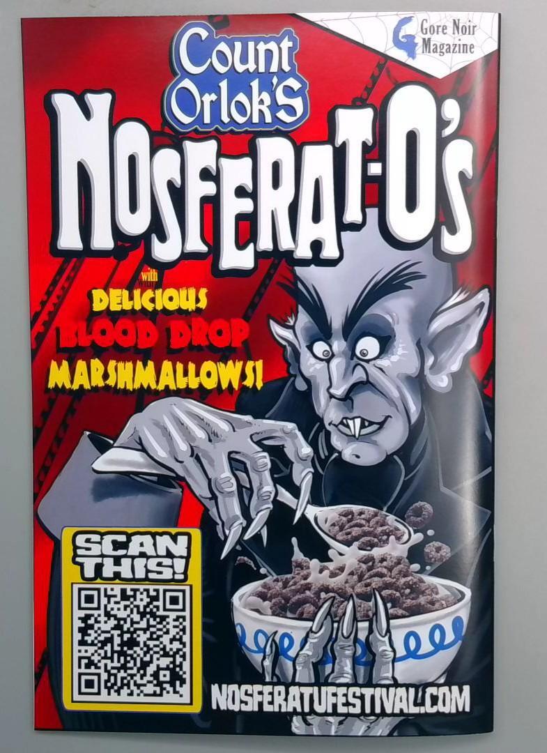 GORE NOIR MAGAZINE ISSUE 1 - First all-new limited edition issue of this special comic-sized magazine. This debut issue features striking horror-themed artwork with a grotesque clown character as the centerpiece, rendered in bold red and white tones with splatter effects. The cover showcases the magazine's dark aesthetic and includes a bonus variant featuring Count Orlok's Nosferatu's O's cereal parody tie-in, which cleverly blends classic horror imagery with absurdist humor. SPECIAL EDITION: $15.00 - Marked as a special comicized edition with variant cover artwork available.