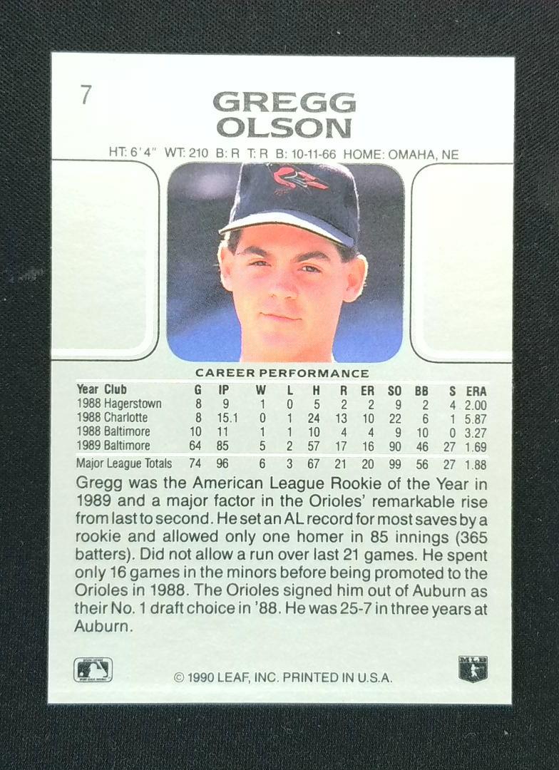 Keywords: Gregg Olson 1990 Leaf baseball card rookie card Baltimore Orioles collectible baseball memorabilia pitching motion American League Rookie of the Year sports cards
