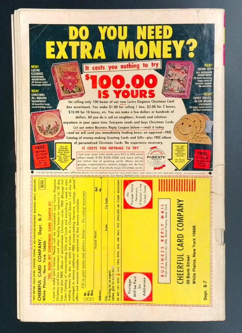 The back cover includes a vintage advertisement for the Cheerful Card Company, offering a money-making opportunity selling Christmas cards and greeting cards, typical of promotional content found in comics of this era.