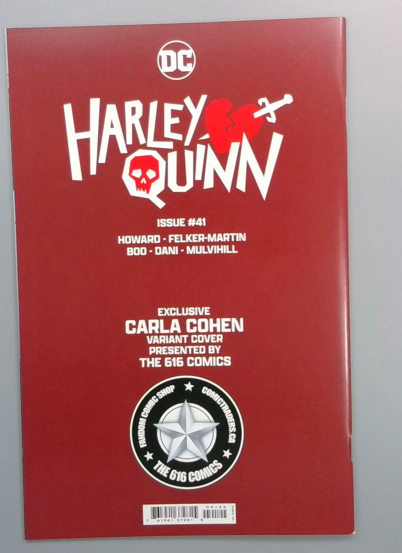 Harley Quinn #41 features an exclusive variant cover by Carla Cohen, presented by The 616 Comics. The issue is part of the ongoing series by creators Howard, Felker-Martin, Boo, Dani, and Mulvihill. The striking black and white cover art showcases Harley Quinn with dramatic red eye makeup and a intense, compelling portrait that highlights her complex character.