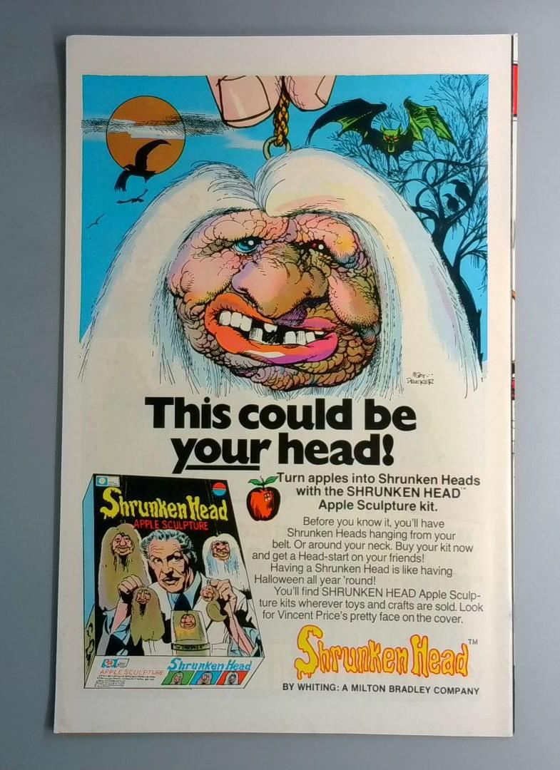 Also included in this issue is a vintage advertisement for the Shrunken Head Apple Sculpture kit by Whiting, a classic 1970s novelty toy that promised to transform apples into collectible shrunken head figures—a charming artifact of the era's toy marketing culture.