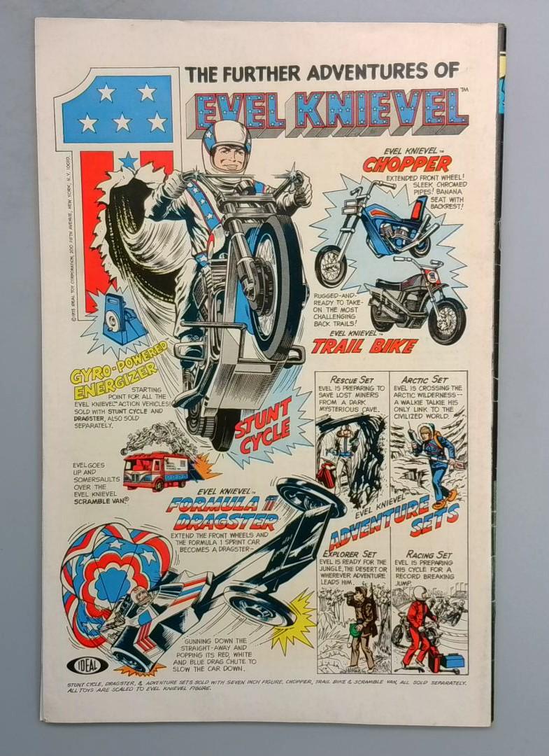 Evel Knievel (Further Adventures) - A toy/product tie-in advertisement page showcasing the extensive Evel Knievel action figure and vehicle line, including the Chopper motorcycle, Stunt Cycle, Trail Bike, and various accessory sets like the Rescue Set, Arctic Set, Explorer Set, and Racing Set, all featuring the iconic daredevil character and his vehicles.