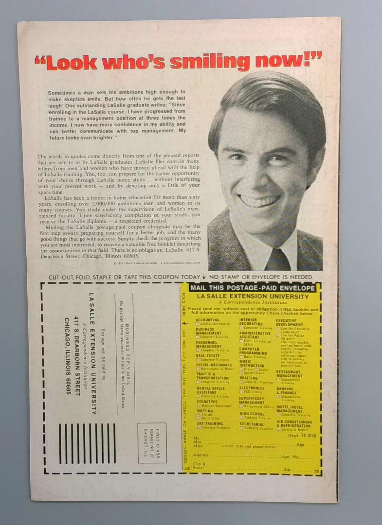 This copy includes an inserted mail-away coupon for LaSalle Extension University correspondence courses, a common premium insert found in Marvel comics of this period.