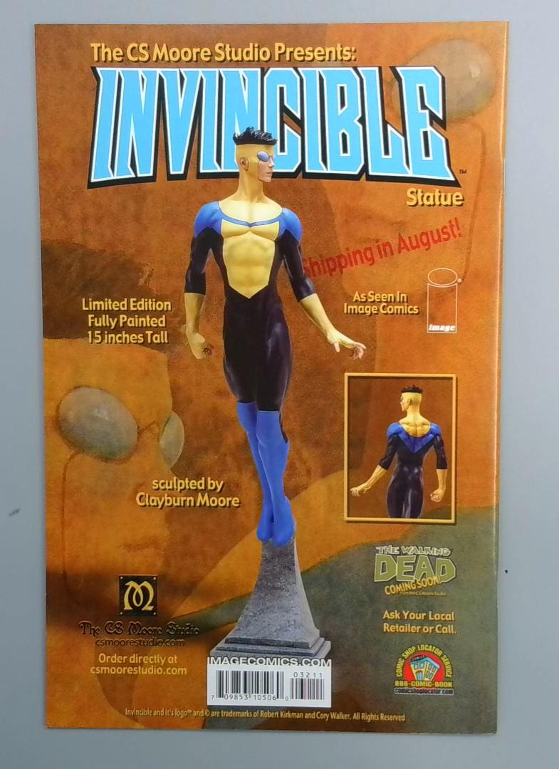 Invincible #32 comic book from Image Comics, featuring the classic cover art by Kirkman, Ottley, and Crabtree. The issue is in good condition with vibrant colors and intact spine. Includes a promotional insert for The CS Moore Studio's Invincible statue collectible. A solid addition to any superhero comic collection.